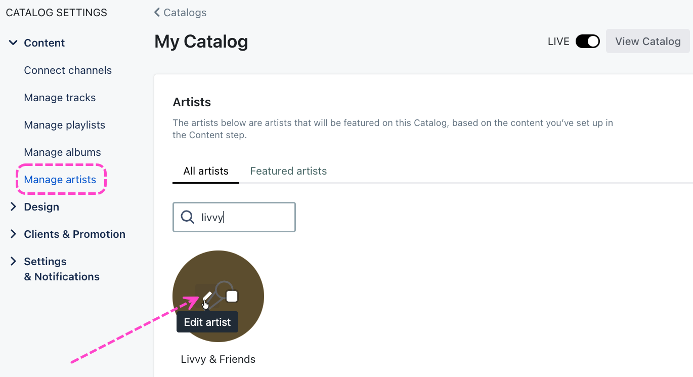 - Locate the Artist from the list, hover over their name, and click the pencil that appears on the right of the name to Edit profile.