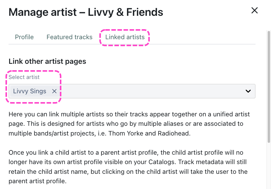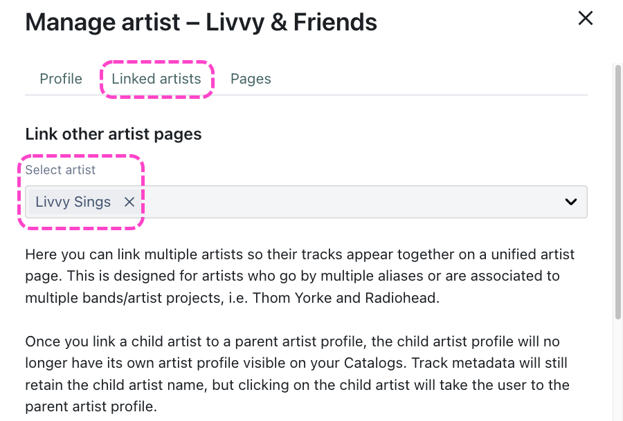 After the artists are linked, only the parent artist will have an Artist Profile in your Catalog.