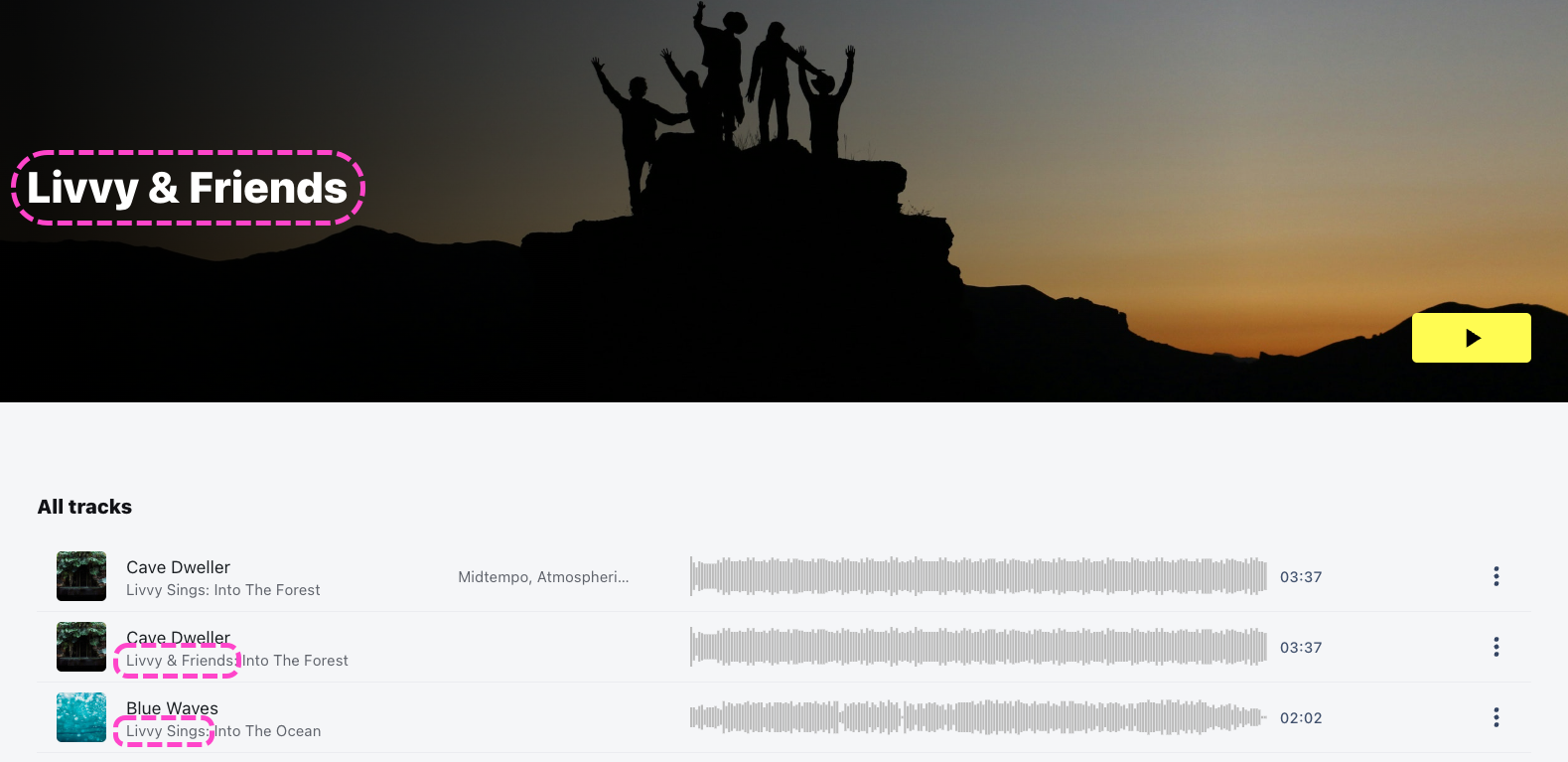 We want Livvy & Friends to be the parent artist, meaning Tracks from Livvy Sings should be nested under the Livvy & Friends Artist Profile.