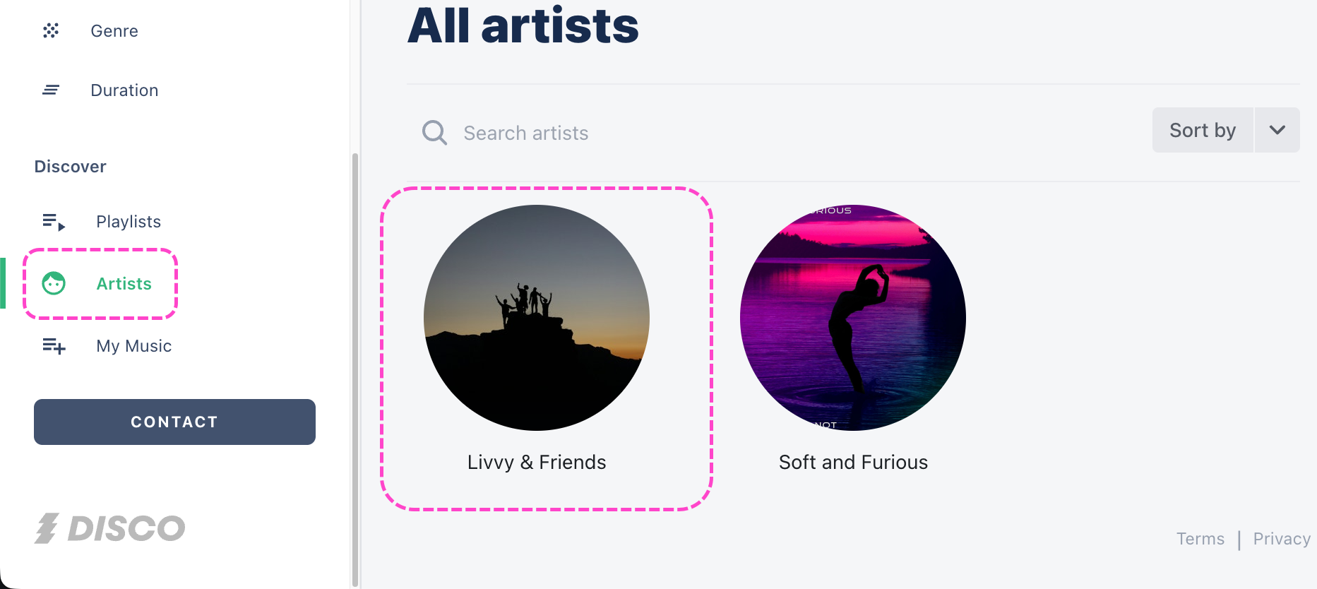 Note: If you can't find an Artist in your DISCO, ensure that the Artist's name appears in the Track metadata and is spelled correctly.