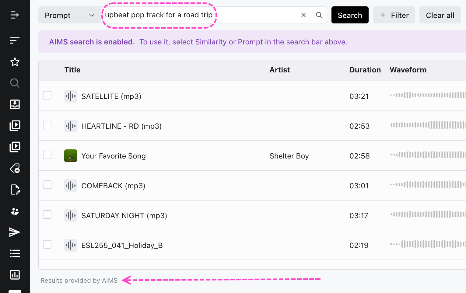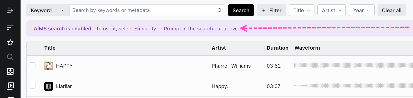 Once we've enabled the AIMS integration in your DISCO, there's nothing else you need to do! All newly uploaded Tracks in your DISCO will automatically be synced with AIMS and will be available in the search shortly after.